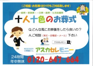弊社アスカセレモニーでは、ご家族様のご要望をよくお聞きして どのような最期のお別れをされたいのかをご納得ゆくまでお打ち合わせをいたします。 ご葬儀をパターン化や定型化することなく、「十人十色」また 「一人十色」のお葬式を […]