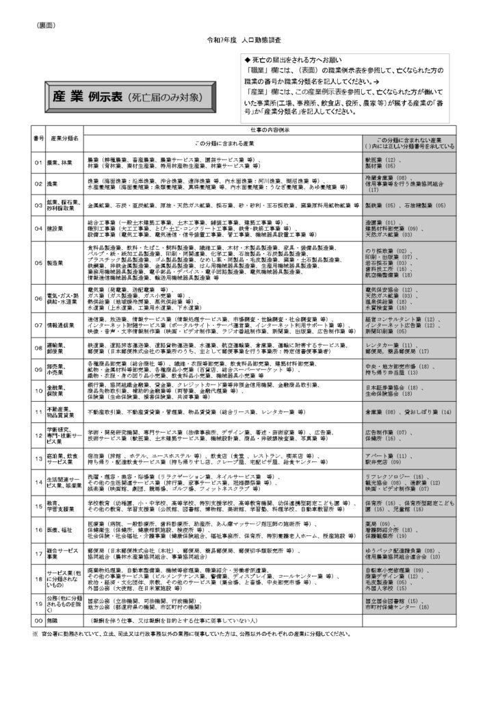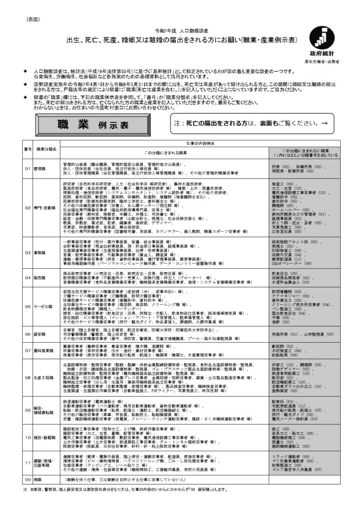 厚生労働省よりの国勢調査による死亡届の職業欄の記載のお願いです。