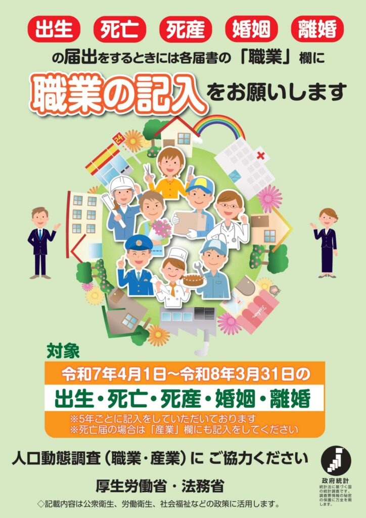 - 令和7年4月から令和8年3月までの出生、死亡、死産、婚姻及び離婚が対象となりますので、